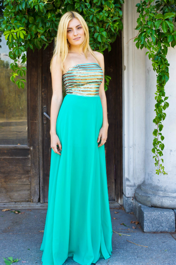 Юбка из вискозного шифона с разрезом, лиф сшит из плотной сетки украшенной пайетками золотого и бирюзового цвета